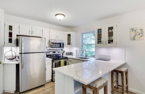 The house comfortably sleeps 10 people. One room has a king bed, two rooms have queen beds, and the third room has a full-on–full bunk bed which sleeps 4 additional guests comfortably. Enjoy the year round sun room overlooking the lake. After enjoying the lake relax in our huge 8 person hot tub (open all year round), or by the lakeside fire-pit. After skiing come home and sit by the wood burning fireplace. Along with the recently remodeled kitchen and baths and beautiful wood floors, our year-round lakefront home in the mountains is a must stay retreat for your next family vacation.
