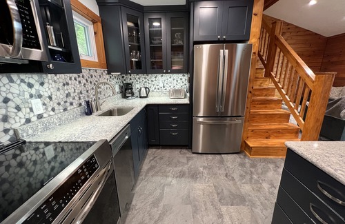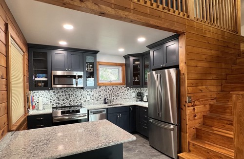 Additional description: Drive right up to the water’s edge & climb only 4 steps to enter the 4-season house. The very recently updated interior is small in square footage (1200 sq. ft), but cozy, comfortable, & well-appointed. The beautiful small-space chef’s kitchen is efficient & well-stocked with cooking equipment. A new induction range provides lots of heat & fine temperature control while also minimizing our eco-footprint (a similar experience to cooking on gas cooktops). An open floor plan offers lake views from most of the common areas. On the first floor are 2 bedrooms (1 Queen/2 Twins) & a full bathroom with a shower. The staircase leads to a second floor with a half bathroom (sink & toilet), a 3rd bedroom (1 Queen) & an open loft TV area. The beds have the very same ultra-comfortable memory foam mattresses beloved by guests at our other cottage. This is a limited square footage home so the 1.5 bathrooms are small, but also clean, efficient, & boast heated floors & lighted mirrors! Recently updated decor features a retro cabin aesthetic with modern conveniences and styling. Eco bonus: Heat & AC is provided by an efficient heat-pump system & all electricity supplied to the property is 100% solar generated, purchased from a nearby solar farm! Aside from the fireplace, the house is run by the sun!