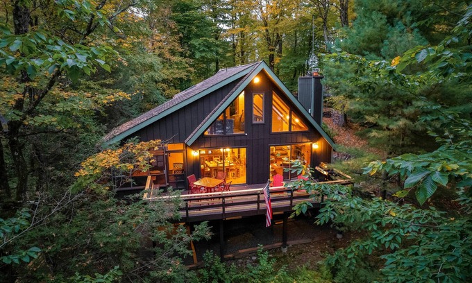 → Bright, lakefront chalet offering a private dock in a tranquil forest backdrop