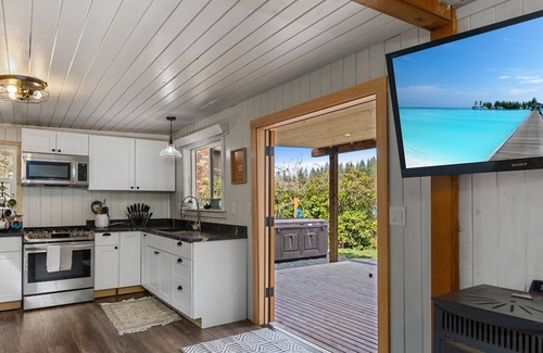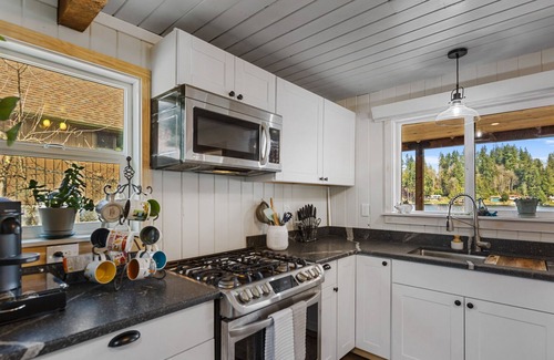 Lakeside Cabin is an intimate 450 sf open concept that faces Lake Bosworth, sitting only 50' from the shoreline. Lakeside has been lovingly renovated throughout to with an emphasis on integrated indoor and outdoor living. It includes a beautifully tiled 2 shower head walk in shower, a huge covered front porch, gas fireplace, hanging daybed, and a 6 person hot tub just steps from the porch. This cabin is the prefect couples retreat, it is cozy and inviting inside yet all the lakeside windows and custom engraved French doors draw your attention to the pristine lake and views of Mt. Pilchuck.