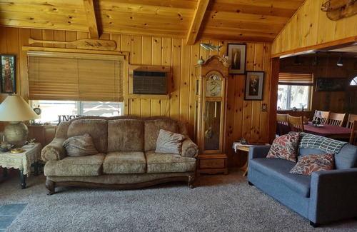 This 3 bedroom 2 bathroom family cabin gives you the feel of your family's own cabin on the lake. The fisherman themed interior sets the scene for this majestic setting. 7 miles from Silverwood. This two level home has a hot tub outside the downstairs room that overlooks the lake. The upstairs has 2 bedrooms including to the master bedroom which includes a master bathroom that has a front load washer and dryer.. The downstairs has 1 bedroom with a double sized bunk bed, great for kids.. Smaller adults as well. The love seat in the living room folds out to a single bed best for kids. A paddle boat, canoe, and kayak are available for recreation as well as a fire pit. Includes a float dock if one chooses to bring a boat. No parties please, parking is limited to 3 vehicles, possibly 4 at property. Golf course a mile away on twin lakes. Keurig machine, Air fryer, Vita mix, outdoor gas BBQ