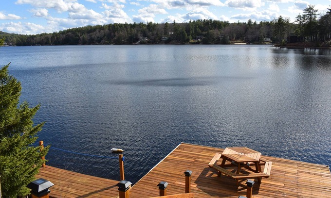 Come enjoy your peaceful getaway on Lake Horace where there's something for everyone to enjoy. Make memories in the summer while swimming in the sandy lake just steps from the back door. Jump off one of two private docks or floating raft, kayak, go fishing, or simply enjoy the view of the sunset from one of three spacious decks off the house. Kayaks and life jackets are available for guest use. Autumn brings beautiful foliage and quiet moments to enjoy the crispness in the air. In the winter, enjoy ice fishing and skating on the lake or visit nearby snowmobiling trails if you like a little more speed! Have fun skiing, snowboarding, or tubing at Pat's Peak, just 10 minutes away. Springtime is alive in Weare, NH as the ice on the lake melts and the birds rejoice while the sun warms your face.