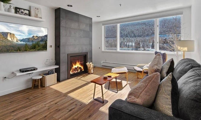On the other side of the dining table is the bright and cozy living room, a stylish haven perfect for kicking back and relaxing. Outfitted with a plush couch, a chair with an ottoman, a large mounted TV, and access to a balcony, this space has all you need to feel right at home. Step out to the balcony and take in the impressive lake views, or curl up in the living room while you warm up by the beautiful stone fireplace. The living room can be used as an extra sleeping space with the couch doubling as a pull-out queen bed.