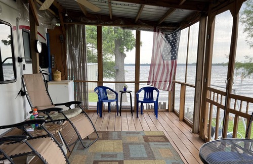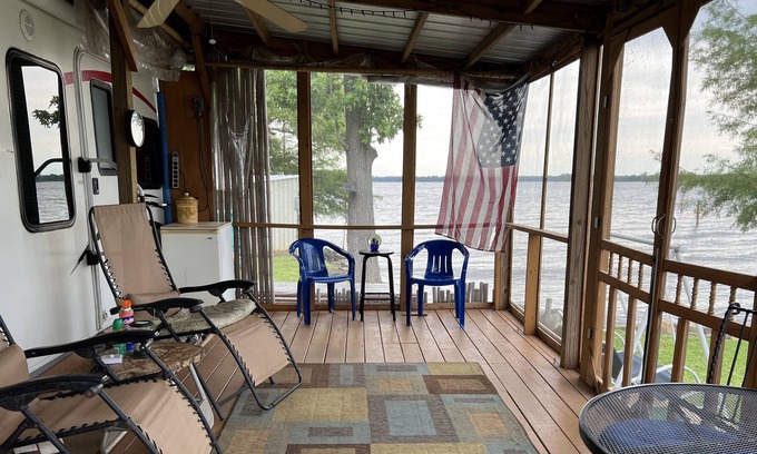 Come rest/play on the water in my 29 foot- 2 bedroom RV, parked just feet from the shore on Lake Palestine - over 135 miles of shoreline. There is also a fish cleaning station and 2 boat ramps within a 100 Yards of camper- Enjoy sunsets on west facing, screened in porch, and fire ring with campfire wood furnished.