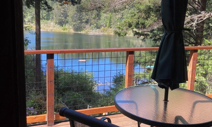 Escape to the beautiful Oregon coast, enjoying the calm waters of Collard Lake. Charming lakeside cabin has 2 decks from which to lounge and take in the magnificent lake view. Enjoy the dock and paddle the kayaks or canoe on this spring-fed lake. Watercraft, paddles and life jackets are provided. The comfortable cabin, located in a quiet area of large fir trees, includes a full well-equipped kitchen, large screen TV with Roku, and wireless internet service. Enjoy music from Pandora or Spotify on the bluetooth/CD compact shelf system. The bedroom includes a comfortable queen bed. There is a double futon sofa bed in the TV room and a double sofa bed in the living room.