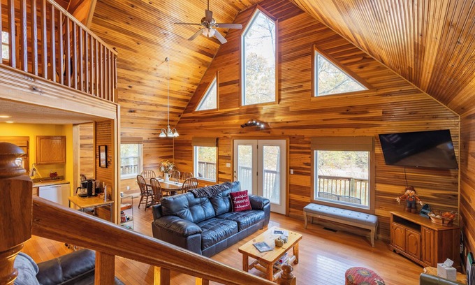 Our 4-br, 3.5-ba lakefront cabin sleeps 13 and offers serene, picturesque views with a private dock two kayaks and a canoe. Unwind in the luxurious hot tub on the deck. Inside, enjoy the comfort of 3 queen beds, 2 full beds, a twin, and a full pullout couch. Stream your favorite shows with Roku & YouTube TV & end your days by the outdoor fire pit under the starry sky. Pet-friendly & perfect for families/groups, this charming cabin promises an unforgettable getaway filled with relaxation and adventure.