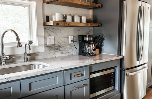 - Fully Stocked Kitchen – Quartzite countertops, stainless steel appliances, and artisan stoneware mugs