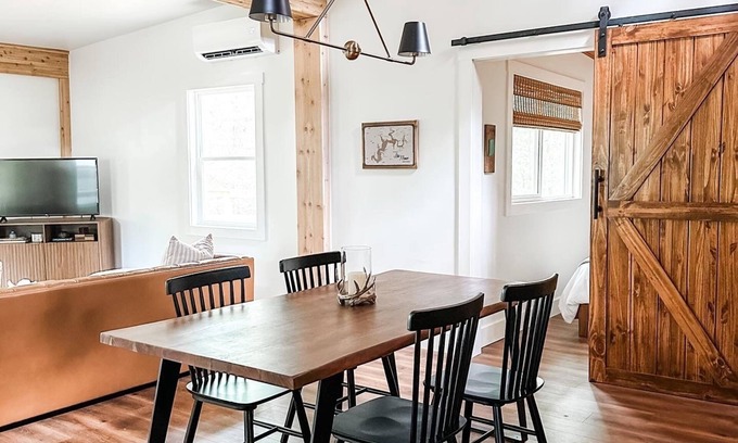 Unwind at this beautifully renovated lakeside cabin, nestled in the woods of Brown County, Indiana. Enjoy the water and forest views from the new deck or one of the outdoor living spaces.