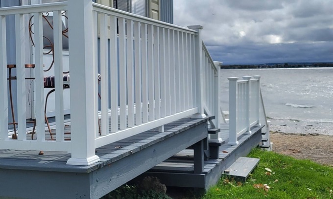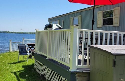 Fully furnished just 13 miles from the Salmon Run Mall. Sleeps 4; 2 bedrooms each with a full-size bed. Location and 4 floor-to-ceiling windows facing the open lake make you feel like you are floating as you experience Lake Ontario’s extraordinary natural beauty in your living room and kitchen. (You actually feel like you are right on the shore). The main deck features a Weber spirit grill and there is a small reading deck to relax and enjoy your morning coffee. Recently we added a deck facing the lake, very relaxing. Other amenities include a quiet, kid friendly cul-de-sac; cable TV; Wi-Fi, and a well-equipped kitchen with a microwave, full size gas stove and refrigerator. Best of all it is affordable; cheaper than most motels in the area.