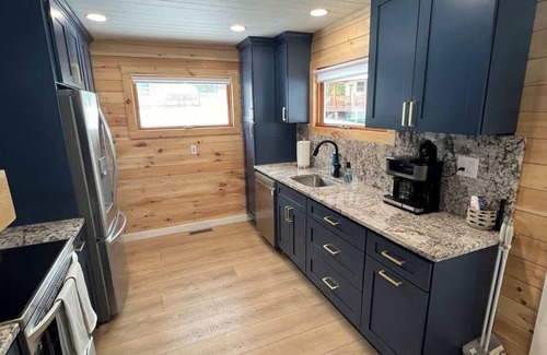 Fully equipped with everything you need for a comfortable and enjoyable stay, including a fully stocked kitchen, cozy living room with fireplace, large deck with seating and dining area, and more.
