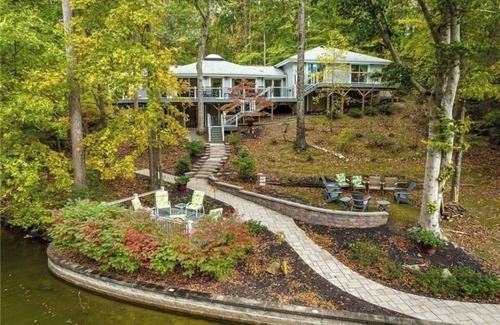 Serenity is surrounded by mature trees with spectacular color. located in a quiet, safe cove with main lake views only 15 minutes from food and specialty shopping by car and 10 minutes to lakeside amenities, restaurants, etc. and gas by boat. large screen smart TVs. Also an indoor fireplace and outdoor fire pit (wood is provided.) Swimming is safe and enjoyable in 10 feet of water at the end of the boathouse deck in a no wake zone. Guests are provided with floating chairs, water toys, life vests, a paddle board and kayaks; Decking with table and chairs are conveniently located next to the boathouse and are accessed by stunning, lighted rock and stone walkways. You feel absolutely secluded as the other homes are tucked out of sight among the trees.