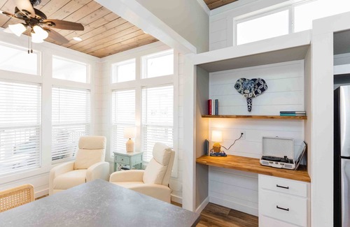 Step inside and be greeted by a thoughtfully designed space where every inch has been optimized for comfort and functionality. The sleek and chic interior features a stylish decor that exudes charm and character. Designed to sleep two, this tiny home features a king bed with luxury linens, a full bathroom with a walk-in shower and a double vanity. The well-equipped kitchenette beckons aspiring chefs to whip up delicious meals while the creature comforts such as high-speed Wi-Fi, washer and dryer, and designated parking for two vehicles, makes your home away from home a little...homier.