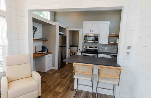 Step inside and be greeted by a thoughtfully designed space where every inch has been optimized for comfort and functionality. The sleek and chic interior features a stylish decor that exudes charm and character. Designed to sleep two, this tiny home features a king bed with luxury linens, a full bathroom with a walk-in shower and a double vanity. The well-equipped kitchenette beckons aspiring chefs to whip up delicious meals while the creature comforts such as high-speed Wi-Fi, washer and dryer, and designated parking for two vehicles, makes your home away from home a little...homier.