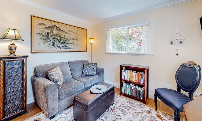 Slip into the lush greenery of this Siuslaw National Forest getaway for your next vacation adventure. Nestled in the trees next to Lake Siltcoos, this calming and creativity-inspiring home is designed to showcase the natural beauty of the Central Oregon Coast. The interior is bright and airy with gorgeous antique furniture accents to put your mind at ease as you escape the everyday. In the spring, enjoy the radiant rhododendrons and lupins, and you'll be able to take in year-round sights of astounding alders, beautiful cedars, and mighty Sitka spruce trees. Bask in nature with the well-manicured and curated splendor this home has to offer, with several outdoor seating areas and views to enjoy. This cozy home sports a kitchenette with a toaster oven, microwave, coffee maker, and double hot plate. The charming and rustic interior is flanked by astounding views from every window for you to enjoy. When you are ready to center yourself and fade into the trees, come enjoy all the comforts that 'Nature Lovers Retreat' has to offer.