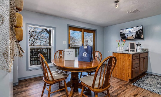 This spacious suite has two cheerful, brightly decorated bedrooms each with NEW king beds as well as a deluxe queen size air mattress, making this a sleeping capacity of 6! We look forward to having you spend your vacation with us at Table Rock Lake in our Lakeside Landing Suite Suite, one of seven suites at Red Bud Cove. This suite has an exterior and an indoor entrance, both of which are up a short set of stairs. Feel free to bring your kayak or paddleboard and take advantage of a level shoreline for easy lake access!! Paved parking is up a slight incline.
