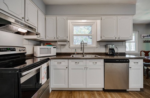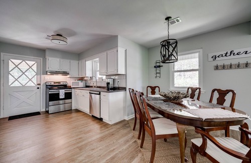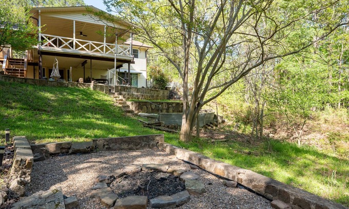 Enjoy Greers Ferry Lake at this newly renovated 4BR, 2BA home on a quiet street by the lake, a 1/2 mile from the marina. This updated home offers all of the makings for a relaxing getaway, complete with a huge deck and patio with multiple outdoor dining tables, two kitchens, a game room with ping-pong, a large fire pit, and office space with fast wi-fi. There are no stairs inside of the home. The home is made of two separate living quarters with stairs on the outside.