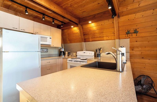 Inside, you'll find a private queen bedroom and a spacious loft with one queen and two twin beds—perfect for families or friends. The open-concept living area includes a fully equipped kitchen, a comfy sitting area, and large picture windows overlooking the lake.