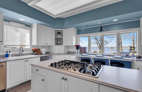The gourmet kitchen, designed for gatherings and unforgettable meals, features elegant white cabinetry, a gas range, and scenic views of the water. Whether you're brewing your morning coffee, preparing a lakeside brunch, or enjoying a private chef’s dinner, this kitchen is as functional as it is beautiful.