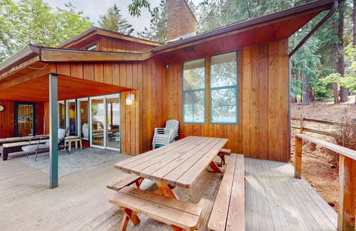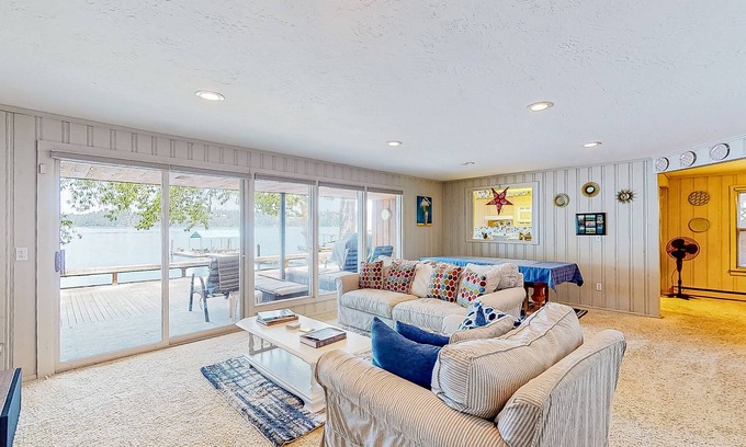 Ready to relax after a day out and about, head for the spacious living room's soft seating. From here you'll be able to simultaneously enjoy lake views while tuning into your favorite TV shows and movies. The adjacent full kitchen presents a pleasant space to play chef with its full suite of appliances and sprawling countertops. When you aren't dining alfresco at the picnic table, eat inside at the breakfast table, or at the large dining table. When you aren't eating at the dining table, engage in some playful competition over a board game.