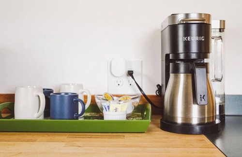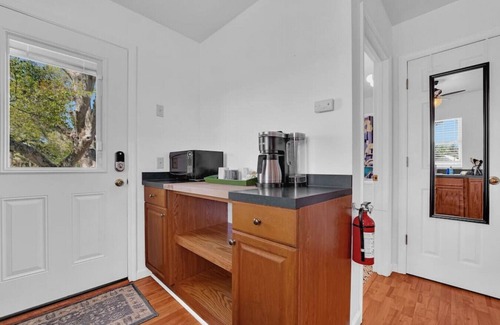 Kitchenette provide practical amenities such as a toaster oven, microwave, refrigerator, a thoughtfully arranged coffee station, and a functional sink area to cater to your culinary needs. Please note: oven or dishwasher is not available with this unit. Adding to your convenience, a washer and dryer are available in the unit, ensuring that your stay is both comfortable and hassle-free. Your Lakeside Studio offers a delightful and functional retreat for your getaway.