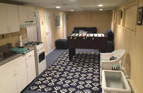 A walk out game room (Shelti professional tournament quality Foosball table, board games, card table) is on the lower level which is also equipped with a small kitchen and a half bathroom.
