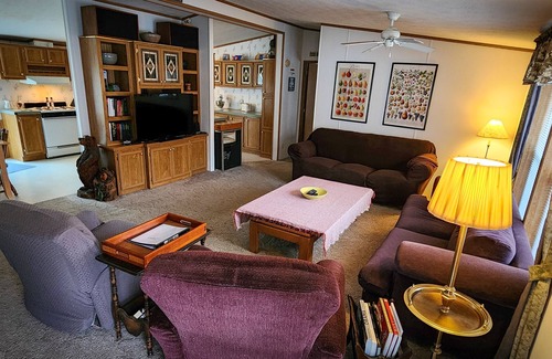 This older, manufactured home is all on one level. It has a classic appeal. The master bedroom, with a queen bed, has an en suite bathroom with a large, deep tub and separate shower. The other two (2) bedrooms have a queen bed, and two (2) beds, respectfully. The additional full bathroom can be easily shared by the two (2) bedrooms.