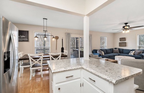 Ample Accommodation: Lakeside Treehouse boasts 4 bedrooms, with 3 of them furnished with king beds, ensuring a restful night's sleep. The lower level offers a haven for kids and the young at heart, featuring 6 beds, a full kitchen, and a bathroom.