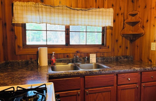 Nestled in Hazelhurst, this delightful cabin offers 3 cozy bedrooms - one with two twin beds plus an additional trundle and two with queen beds. The bathroom features a refreshing shower with a one-of-a-kind handcrafted tile design. A repurposed vanity made from a recycled furniture piece salvaged from the Resort gives you plenty of storage space in the bathroom.