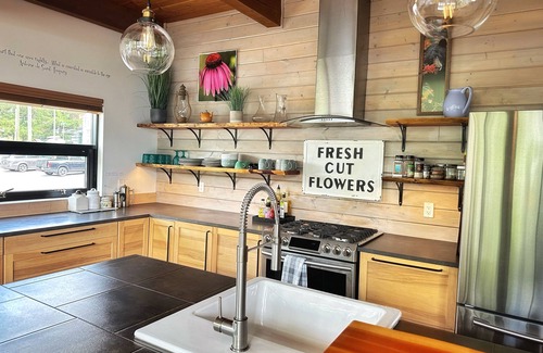 Relax in the living room, with its floor-to-ceiling windows and leather sectional couch, or prepare a meal in the enormous kitchen with its gas stove and 10' fir slab bar with stools. When it's time to dine, gather around the stunning live edge hand-hewn fir dinner table.
