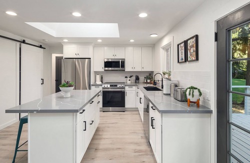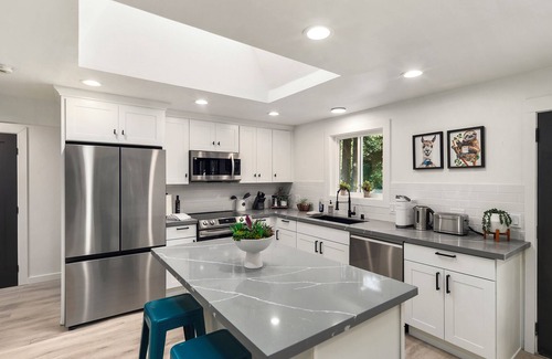 Step inside this sun-filled space to find a welcoming open-plan living area with vaulted, pine-paneled ceilings, sleek hardwood floors, and plenty of room to unwind with friends. Savor a quiet cup of coffee on the deck each morning as you soak up the tranquil surroundings. The chef in your group will relish the well-appointed kitchen with stainless steel appliances and ample counter space. The private dining room provides a perfect spot for meals, or you can dine alfresco on the deck while soaking in the natural beauty around you.