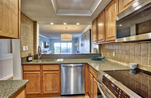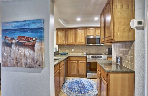 Discover the perfect blend of comfort and charm at this beautifully updated 2-bedroom, 2-bathroom condo in Land's End. The stylish living area has a coastal elegance and opens directly onto the private balcony, where you can sink into the comfortable seating and enjoy the views of the Intracoastal Waterway and St. Pete Beach. Watch the boats go by and hopefully catch a glimpse of dolphins, or even manatees! The well-appointed kitchen has updated, stainless steel appliances and is stocked with all the dishes, utensils, cookware, and supplies you need to prepare meals at home, making it easy to enjoy the convenience of dining in.