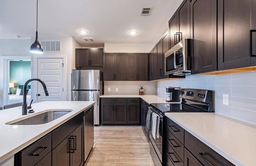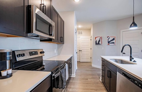 Step into comfort and style at Cadence Sugar Hill, your ideal stay for flexible, fully-furnished monthly or extended visits. Our spacious apartments feature full kitchens with stainless steel appliances, quartz countertops, and kitchen islands designed for cooking and entertaining. Enjoy nine-foot ceilings, wood-style flooring, and in-unit washer/dryers. Relax poolside at the resort-style pool, flow through yoga classes, or work from private office spaces.