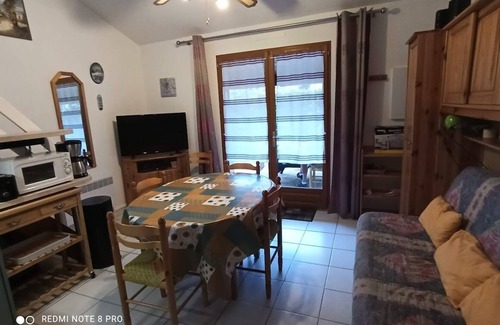 Living room with kitchenette, oven, electric hob, microwave, fridge / freezer, toaster, coffee maker, vacuum cleaner, iron and ironing board, crockery for 6 people.