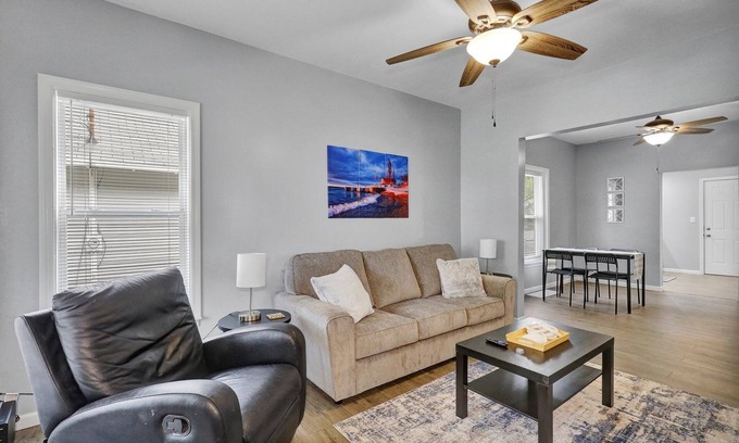 The Lansing Love Michigan house has been recently fully renovated. Your family will be close to everything when you stay at this home in the up-and-coming REO district. When you walk through the front door of this one-story bungalow, you will enter the living room, followed by the dining/office space and the kitchen in the back. The two bedrooms with queen sized beds separated by a Jack and Jill bathroom. You will sleep well on the 12-inch cooling memory foam mattresses and blackout curtains.
