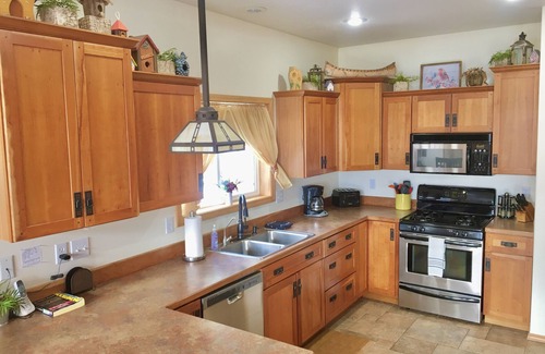 Well appointed, fully stocked kitchen including Instapot, Crockpot, Ninja food processor, blender, tea kettle, waffle/pancake griddle, Panini maker, tons of baking gear and a large pantry.