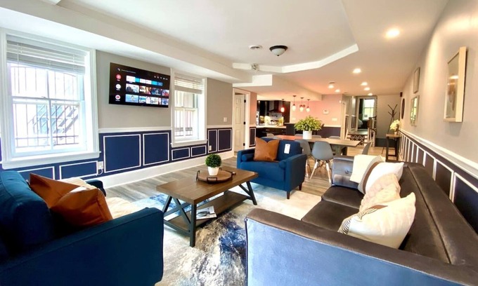 This 5-bedroom, 2.5-bathroom renovated apartment is sprawled out over two full floors to offer excellent separation of space between guests!