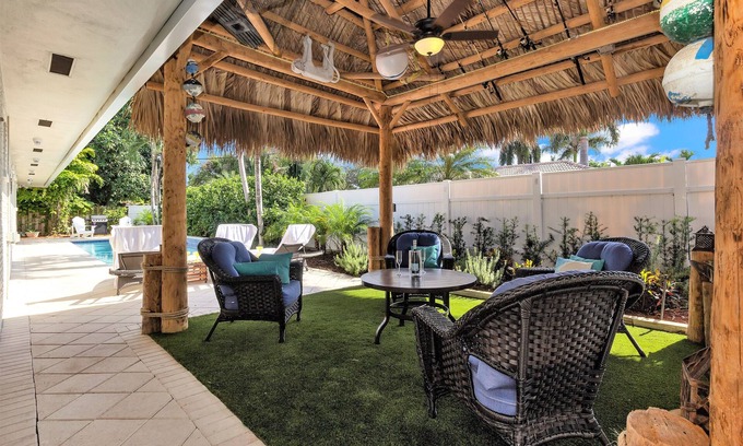 Completely renovated modern style, beach home 3 blocks from Pompano Beach. Only a 7 -10 minute walk and your at one of the most highly rated beaches in the United States. Beautifully appointed 4 bedroom, 3 bathroom home, renovated in December of 2018. Large patio area with 35 x12 heated pool with a covered Tiki Hut with a fan so you can get out of the heat and lounge on plush patio furniture. Need a little sun, there are ample chaise lounges and other furniture around the pool.