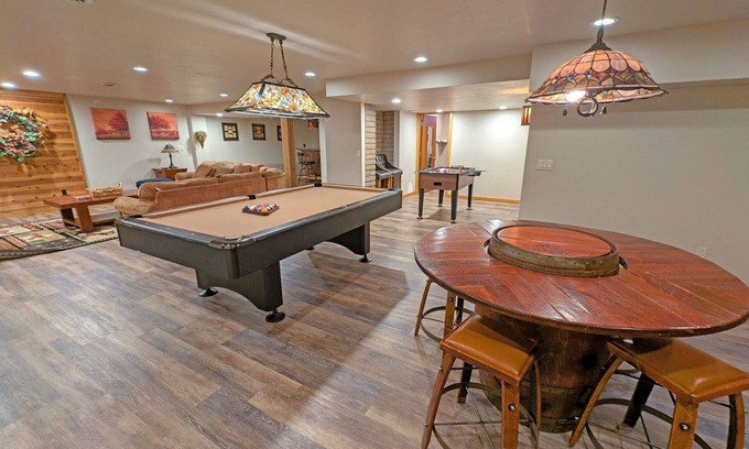 This is a full entrainment area with pool table, Foosball, a full-on bar (beverages not provided), a large comfy couch, Flatscreen TV. There is also the Laundry room and a 3/4 bath with shower downstairs