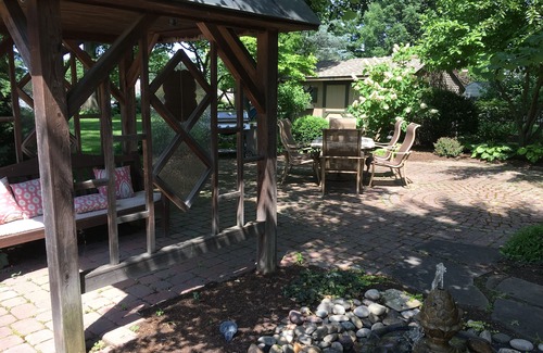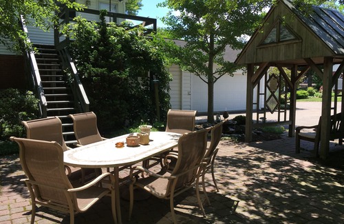 This former bed & breakfast is the perfect home to host a large family, couples' retreat, or a sports team with seven bedrooms and eight full bathrooms. The spacious living room and dining room feature beautiful hardwood floors and a wool rug. A finished family room (with full bathroom) in the basement gives plenty of room for everyone to socialize. The dining room has table seating for 10, plus 4 more at the high-top table in the kitchen. The kitchen boasts a modern stove, refrigerator, microwave/convection oven, and dishwasher. A large capacity washer & dryer are also available for use. Six of the seven bedrooms have queen-sized beds, with the remaining one having two twin beds. A large outdoor patio with tables and chairs is a great place to enjoy a meal outdoors. The beautiful grounds host a variety of perennials for your enjoyment during your stay.