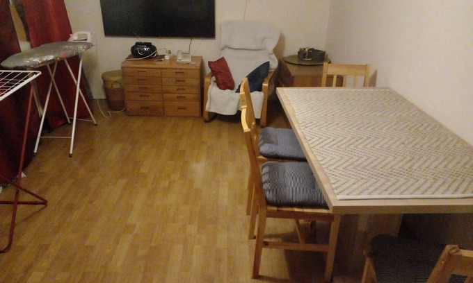 Large two room apartment on the ground floor in an elegant ten story building. Large balcony, the bedroom with a desk and a computer. Living roon with a sofa bed, large smart TV, large table (which folds out to be huge). Located next to park and at the edge of a forest. Quiet, silent street.