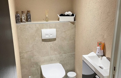 5 minutes walk from the city center 📍 Discover this large apartment on the ground floor with luxurious finishing in a large mansion, very quiet and discreet location, large garden Capacity 11 people Free and secure parking available The apartment has 3 bedrooms and 2 bathrooms, a very large living room with 2 sofa beds A large kitchen with central island and all the necessary appliances/utensils Television, fiber optics, air conditioning, etc. 1 bedroom with a king size double bed 1 bedroom with two single beds 1 large living room, office with 1 sofa and 2 double bed