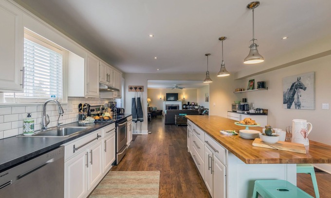 The farmhouse's gourmet kitchen, a masterpiece of design, features a 10' maple butcher block island, seating for 6, stainless steel appliances, and everything needed to awaken the inner chef in you. Adjacent is the dining room, an elegant space with church pew seating and bistro-style arrangements.