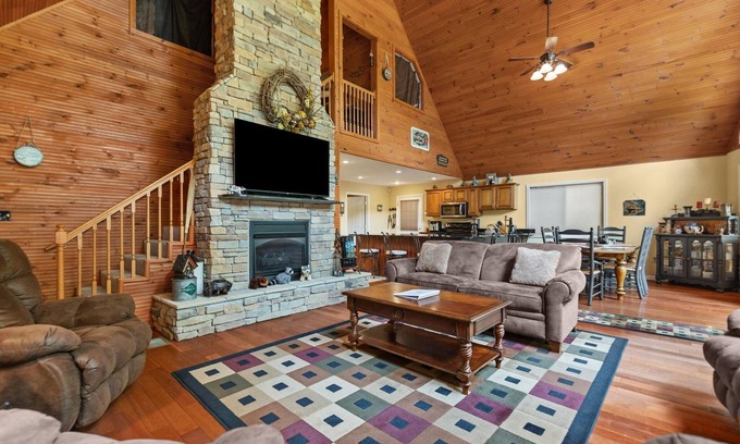 The first floor includes a master bedroom with a king bed, a large flat-screen TV, private porch access, and a Jack and Jill bathroom with a Jacuzzi tub. The main floor boasts a grand living room with vaulted ceilings, a stone fireplace, and a fully equipped kitchen with ample counter space, a dishwasher, refrigerator with ice maker, and more. The adjoining dining area offers scenic views of the lake.