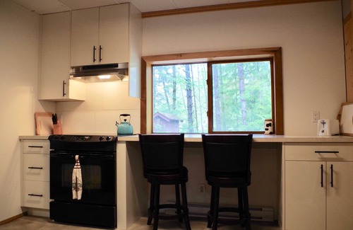The kitchen comes complete with a full fridge with freezer (including ice cube trays), full electrical stove and oven, microwave, dishwasher, and wine cooler. You can choose to sit at the counter and look out the large window, or sit at the dining room table at the far end of the kitchen. Smaller appliances include coffee pot, coffee grinder, toaster, toaster oven, and slow cooker. Pots, pans, and vast cooking utensils provided.