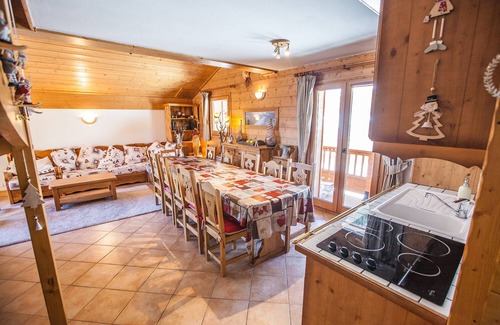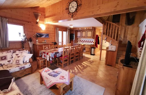 In a recent MGM luxury chalet with heated indoor swimming pool, large duplex apartment of 120 m2 with careful decoration. Savoyard furniture in quality wood.