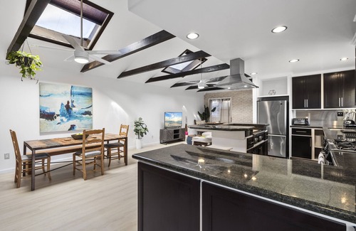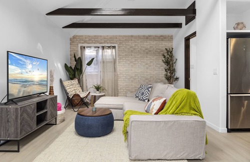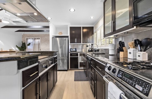This splendid detached guesthouse, just moments away from coffee shops, restaurants, and shops. With vaulted ceilings, this residence offers a generously sized bedroom featuring a CA king bed, private bath, and a walk-in closet. The chef's kitchen is equipped with an indoor BBQ grill and an island bar. Additional highlights include a spacious living room, dining area, AC/heating, and stylish wood plank flooring throughout.