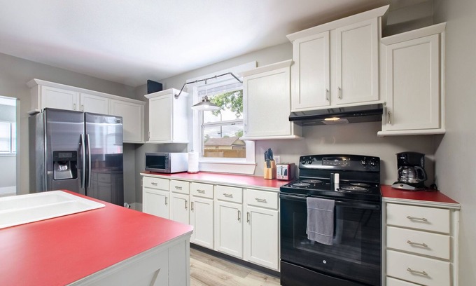 Just off the living area is a clean and friendly kitchen. The cheerful red from the living room continues here, with eye-catching red countertops. White cabinets, a stainless steel refrigerator, and a large island with a sink create an efficient spot to brew the morning coffee and bake some warm muffins in the mornings. Unmistakable farmhouse charm can be seen in the island trim and doors.