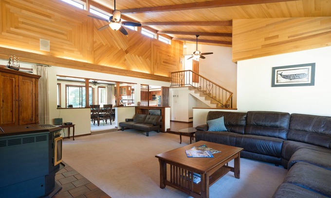 The main living area has natural light emitting down from skylights in the custom wood decorated vaulted ceilings. There is a center stone wall with custom decor and a fireplace to bring the room some inviting warmth. There is also a big screen tv equipped with satellite in case you need to keep updated with the latest sports games or news.