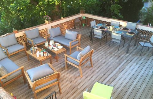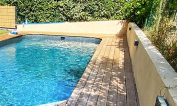 Beautiful outdoor swimming pool of 9x4m and its huge solarium, shared by all resident travellers.