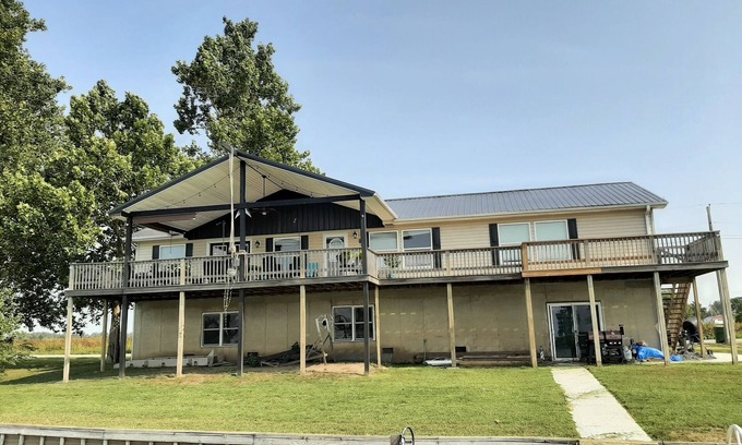 This is a large lakefront home at Big Lake, MO. You will have access to your own dock and small boat ramp. The house is 1,836 square feet and has 3 bedroom each with a queen size bed. In the common area there is three recliners, loveseat and full size couch. Plenty of room if you want or need to bring your own air mattresses. Most likely you will spend a great deal of time on the deck that overlooks the lake. The deck spans 70 feet and the covered area is 35x14. There are shades that pull down to block the sun as it sets in the evening which help to keep the deck cool as well. Inside the home most people seem to congregate around the center island. I also have kayaks and a lily pad available for an additional fee. Currently the lake is pretty shallow by the dock due to no rain so larger boats won't work right now. If you have questions about the property please email. I also offer discounts for longer term rentals if you will be in the area for a while. The basement is not included.